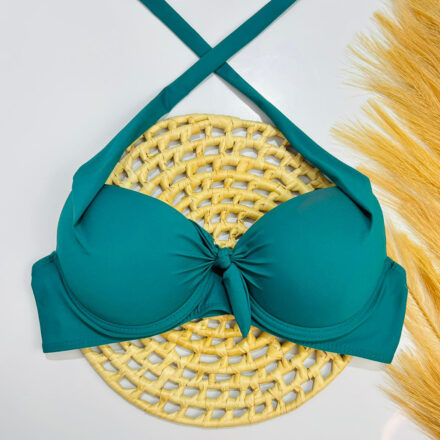 Mergulhe na sofisticação com o nosso top Verde Petróleo. Com um design que une o suporte impecável do meia taça ao charme do nó frontal, esta peça foi feita para realçar sua beleza natural com elegância e conforto. Sinta-se segura e deslumbrante em todos os momentos do seu verão.