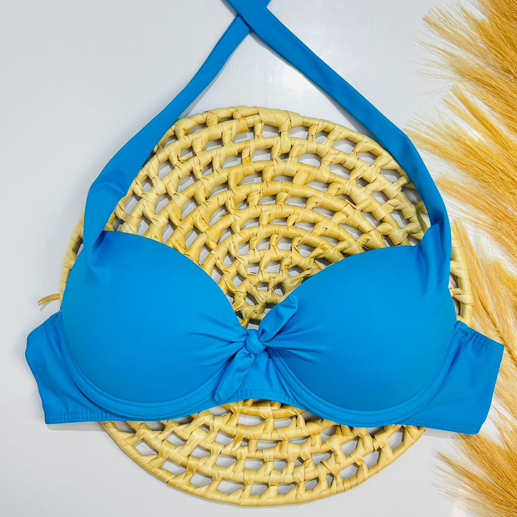 Modelagem: Bojo e aro para garantir sustentação máxima e um encaixe perfeito no busto. Possui amarração no pescoço (halter) e fecho nas costas para um ajuste ideal.