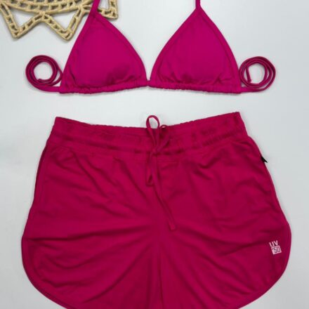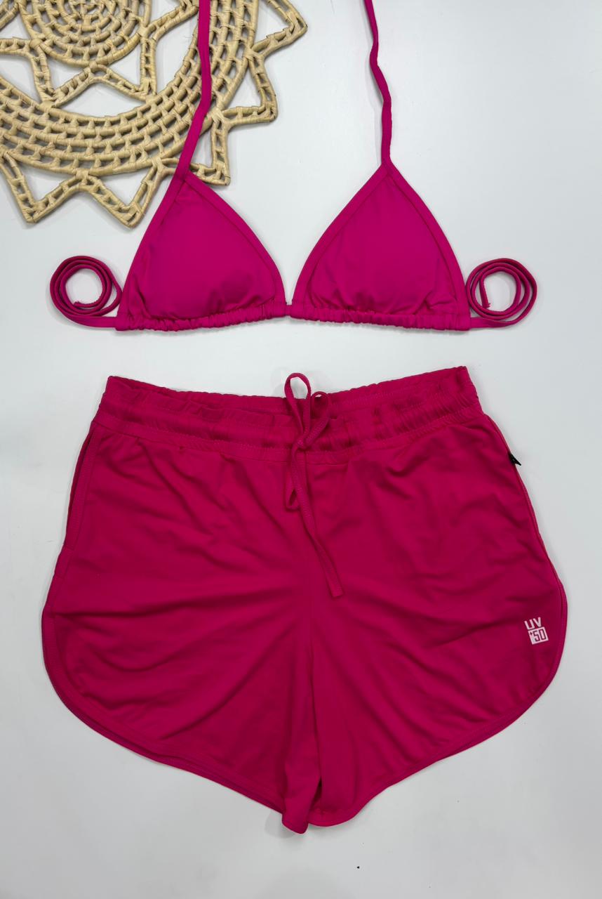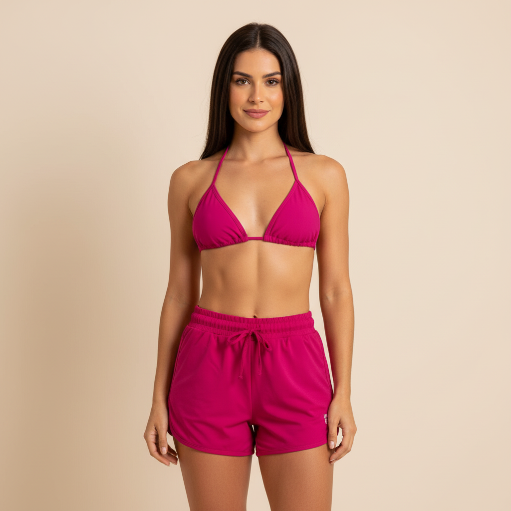 Modelagem: Top triangular ajustável (estilo cortininha) e short de corte esportivo levemente soltinho com cós elástico.
