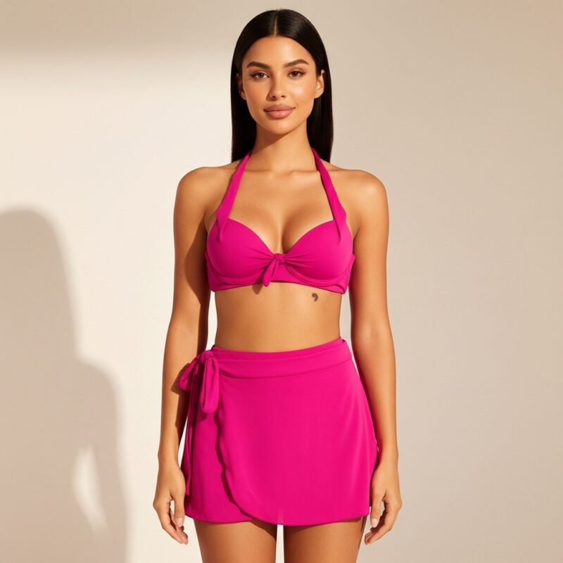 Dica de Estilo: A escolha perfeita para quem não abre mão de sustentação e estilo. Use o conjunto completo para um dia na piscina ou combine a saia com um maiô da mesma cor para um look de resort chique.